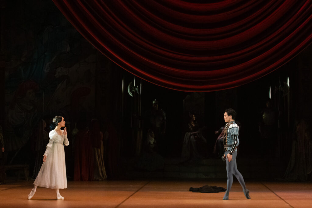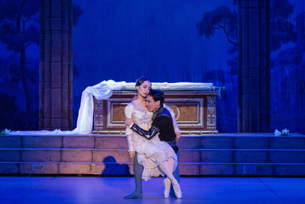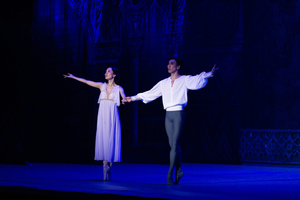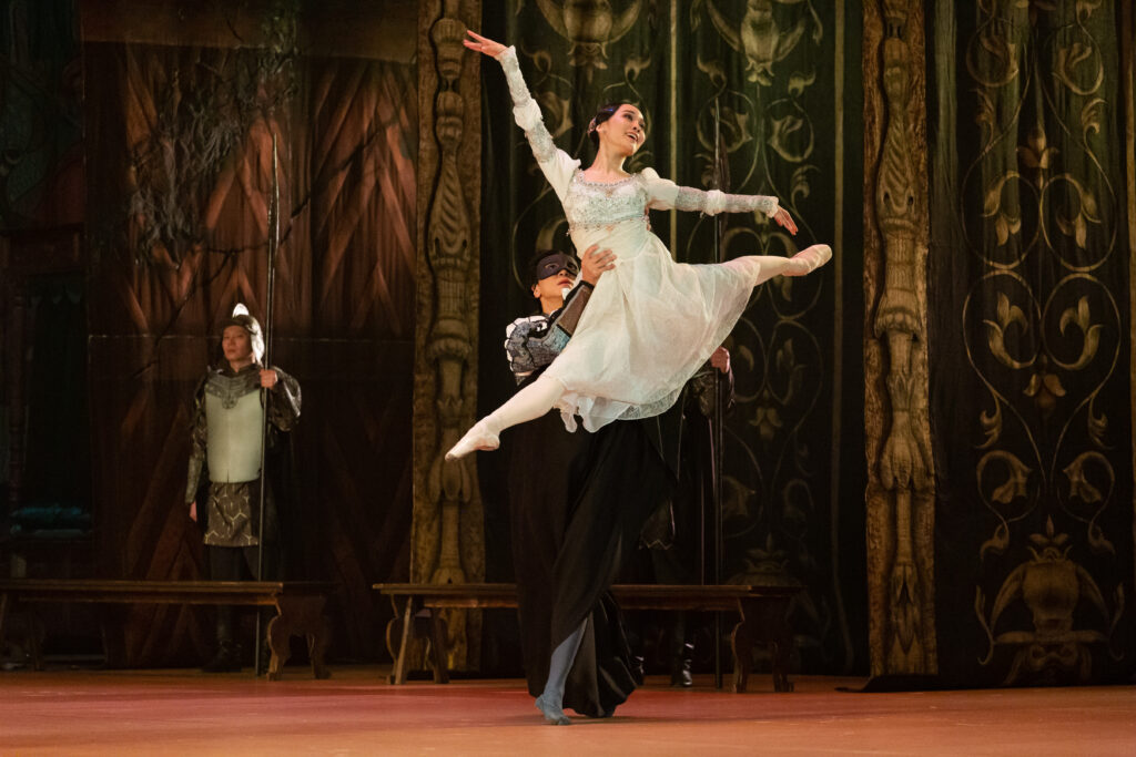 Народный артист Республики Бурятия Баир Жамбалов в роли Ромео вновь доказал, что его искусство не только технически безупречно, но и глубоко душевно. Каждое движение, каждый жест на сцене наполнены вниманием к внутреннему миру персонажа. В этом исполнении Ромео превращается в живую плоть человеческой страсти, в юного героя, который ощущает любовь и жизнь во всей полноте. Зритель не просто наблюдает танец, он вместе с героем проходит через первые трепетные эмоции, радость встречи, страх перед запретной любовью и мучительное предчувствие трагедии.