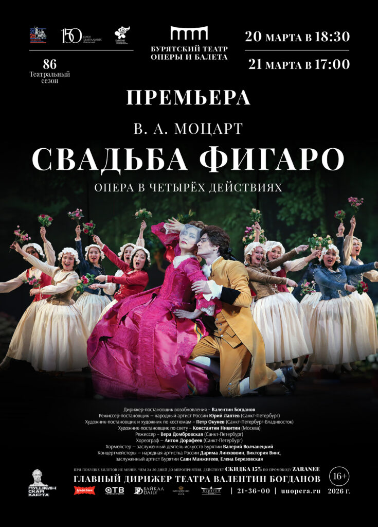 Купить билеты на премьеру оперы «Свадьба Фигаро» 20 и 21 марта можно на сайте и в кассе Бурятского театра оперы и балета. Действует «Пушкинская карта».