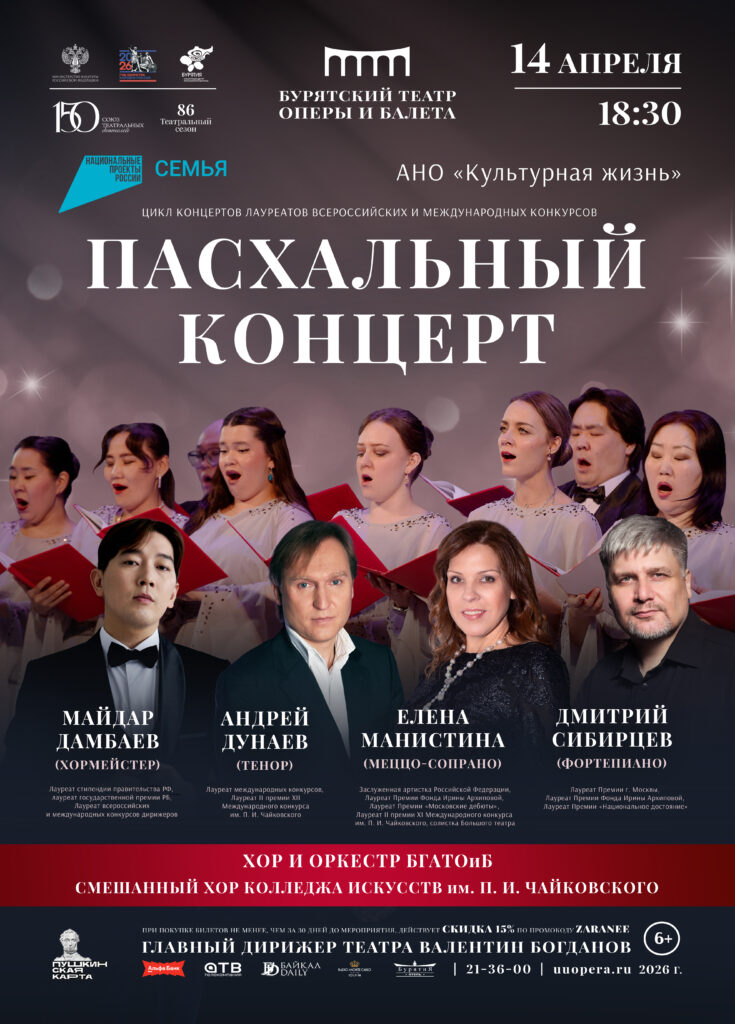 Концерт будет состоять из  двух частей. Первая часть – это исполнители из Москвы — лауреаты конкурса Чайковского Елена Манистина, Андрей Дунаев, лауреат Премии г. Москвы Дмитрий Сибирцев. Они исполнят романсы и прозвучат очень красивые произведения. Второе отделение тоже посвящено Пасхе. Прозвучат голосами наших хоров театра оперы и балета и колледжа искусств имени Чайковского под руководством дирижёра Майдара Дамбаев – выпускника нашего колледжа и Московской консерватории, — отметила министр культуры Бурятии Соелма Дагаева.