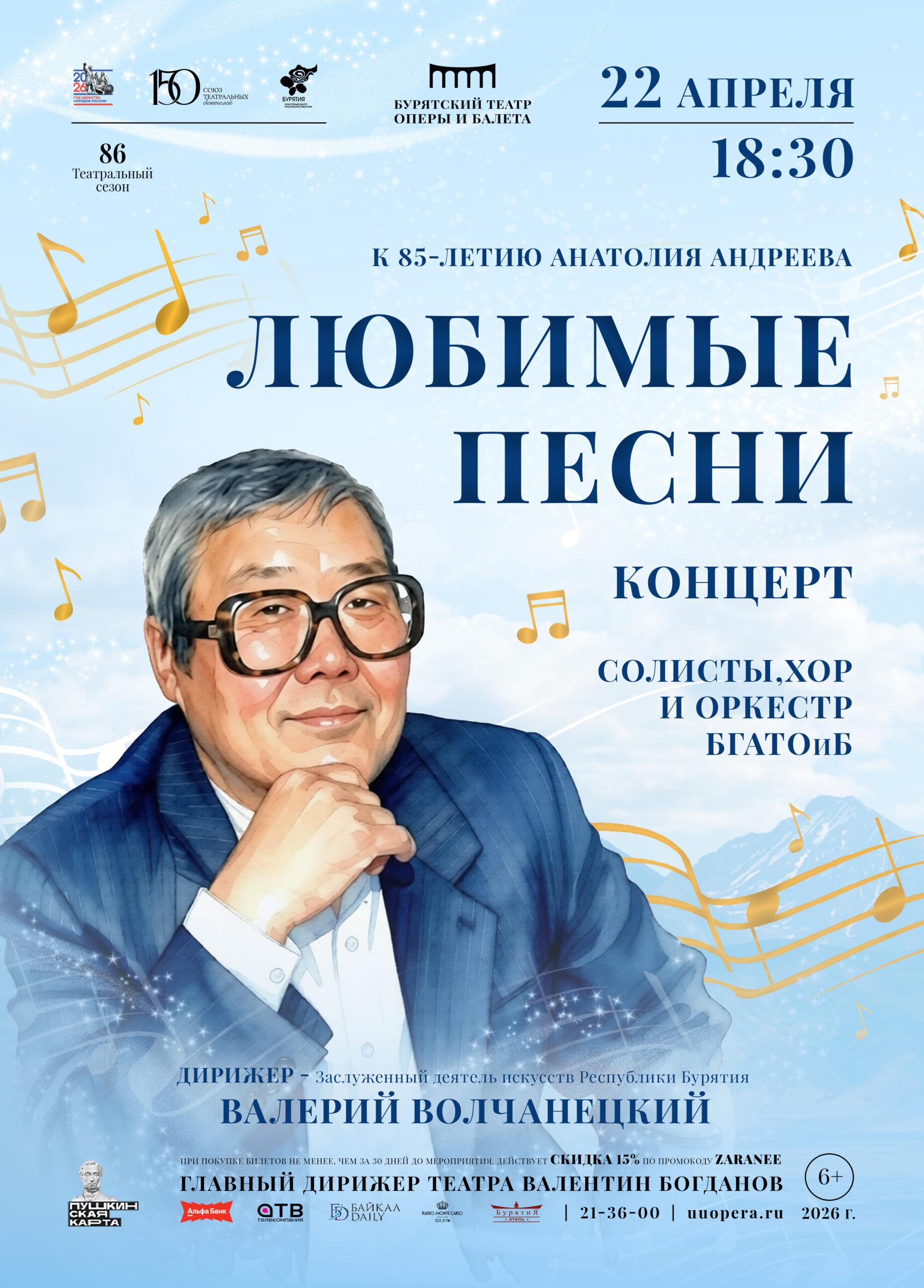 На сцене Бурятского театра оперы и балета зазвучат «Любимые песни» композитора Анатолия Андреева. Концерт станет признанием в любви человеку, чей мелодический дар стал неотъемлемой частью нашей жизни. Концерт станет настоящим событием для всех, кто любит музыку, звучащую в самом сердце Бурятии.